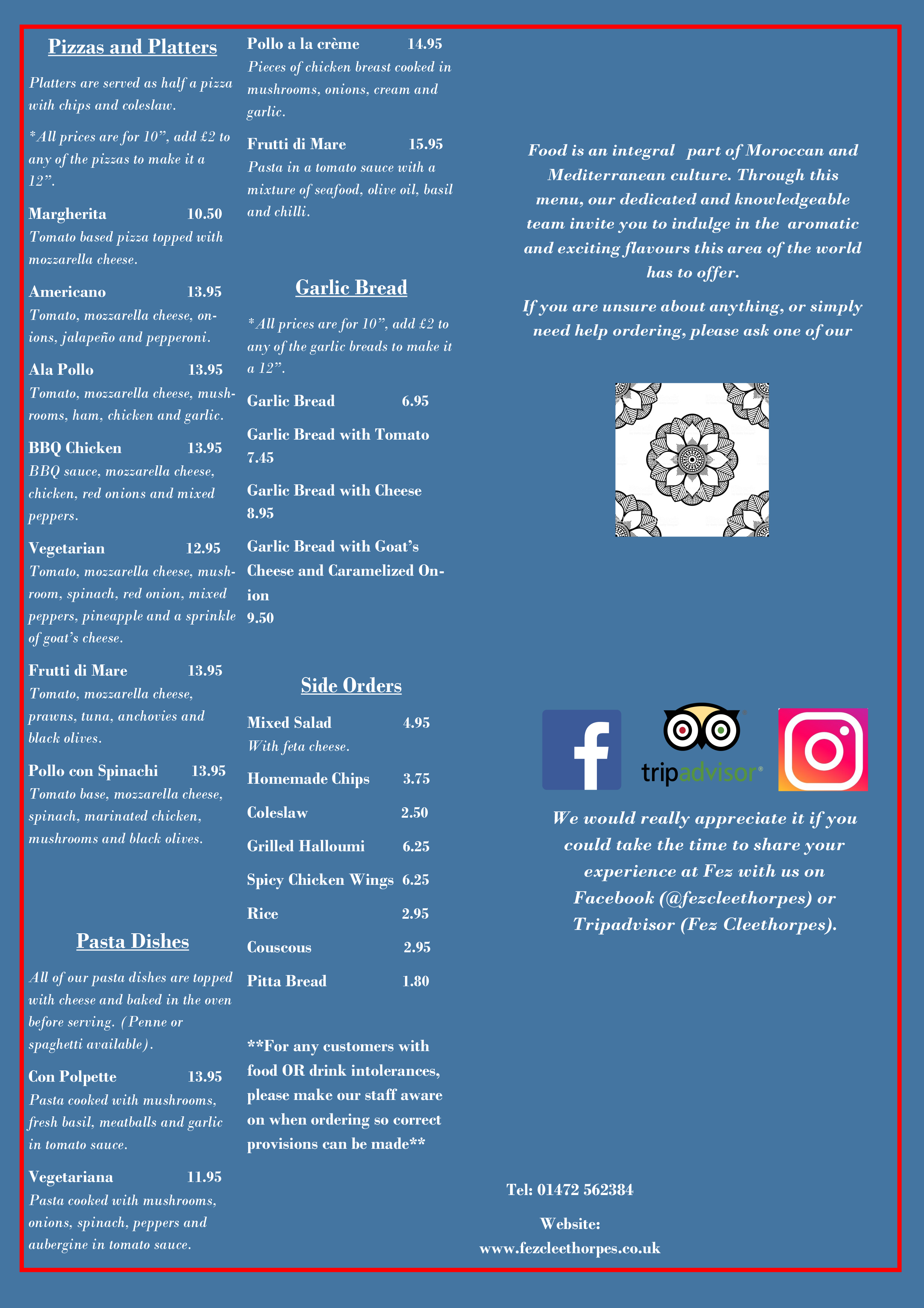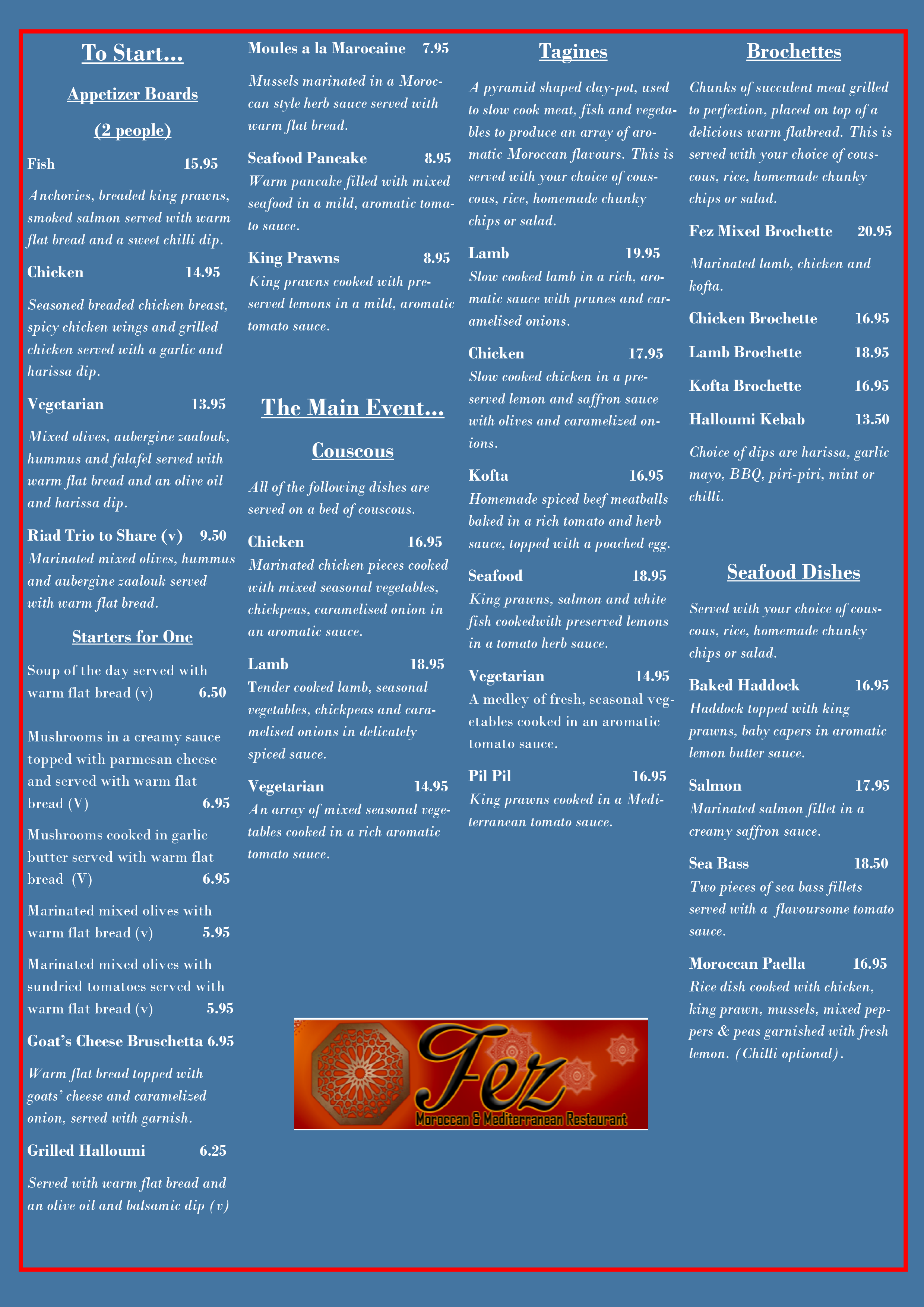 Please take your time looking through our menu, we have a wide selection of Moroccan cuisine including a wide range of vegetarian dishes.
